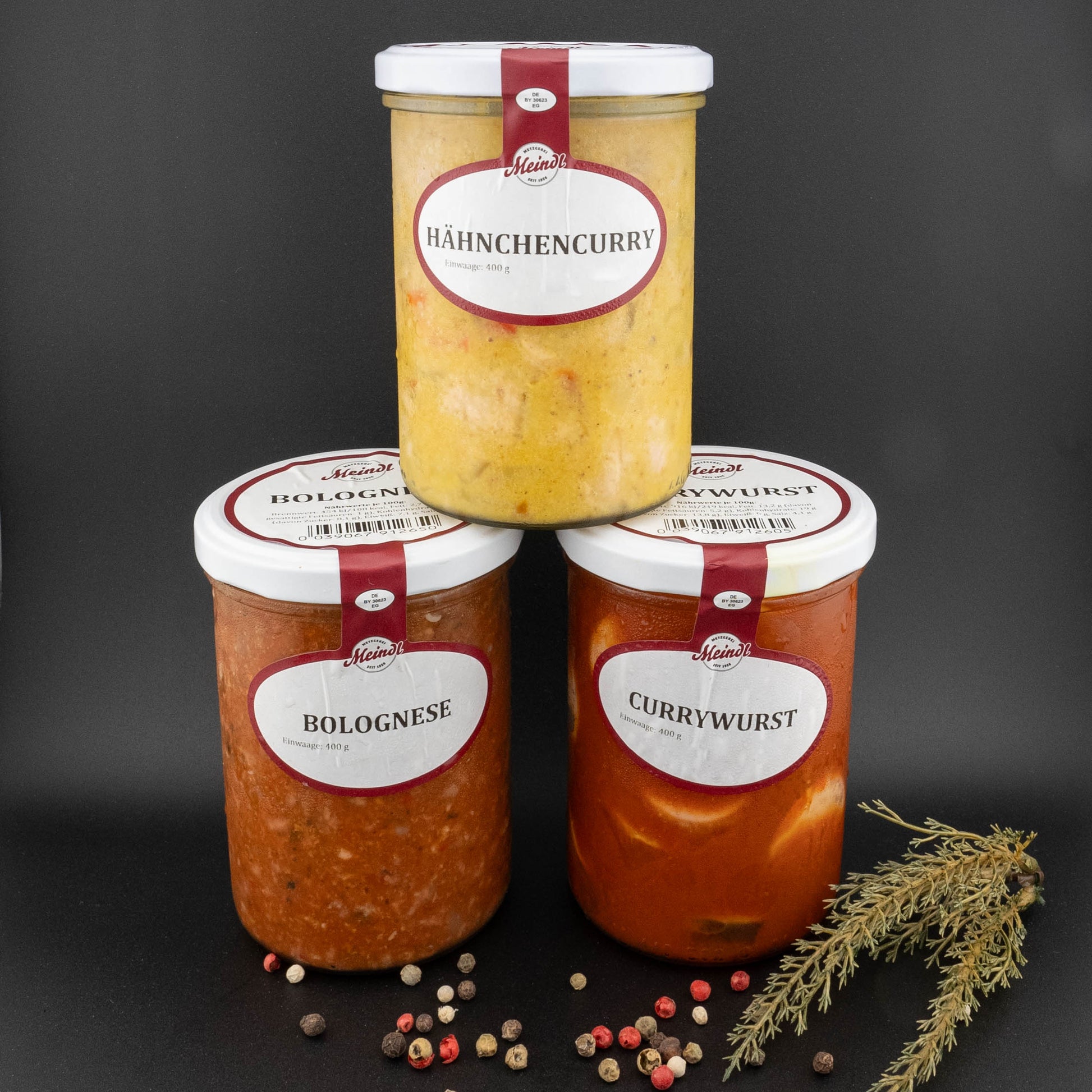 Currywurstsauce (50%), (Glukosesirup, Trinkwasser, Apfelmus (Äpfel, Saccharose, Glukose-Fruktose-Sirup, Säuerungsmittel E330, Antioxidationsmittel: E300, Tomatenmark, Branntweinessig, modifizierte Stärke, Curry (enthält: SENF), Würze, Verdickungsmittel (E412), Karamellpulver, Gewürzextrakt, Gewürz), Wurst (50%) (Schweinefleisch (51%), Rindfleisch (17%), Speck, Trinkwasser, Speisesalz, Gewürze, Stabilisator (E262, E331, E450), Antioxidationsmittel (E301), Dextrose, Geschmacksverstärker (E621), natürliches Aroma (enthält SELLERIE), Konservierungsstoff (E250)