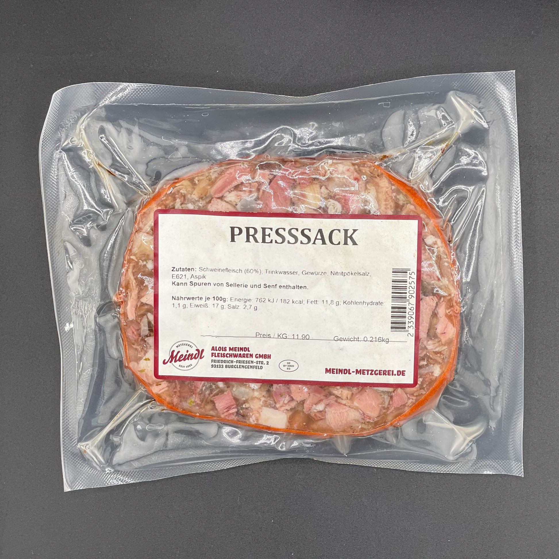 Unser Presssack ist eine traditionelle Köstlichkeit aus hochwertigem Schweinefleisch und würzigen Gewürzen. Durch sorgfältiges Pressen erhält er seine feste Konsistenz und unverwechselbaren Geschmack. Ideal als herzhafter Snack. Ob auf Brot, zu Kartoffeln oder als Bestandteil einer deftigen Brotzeitplatte - der Presssack ist vielseitig einsetzbar und sorgt immer für Genussmomente.